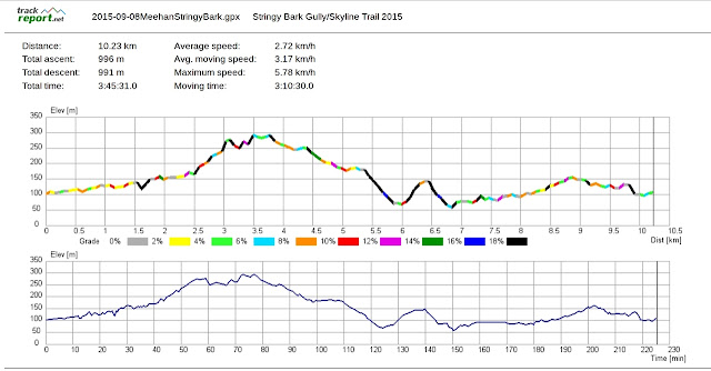 We continue along beside the dry Barilla creek bed into Stringy Bark Gully. Eventually we come to where the bike track splits off to the right and a steep rocky fire trail goes up on the left. It doesn't look too inviting on the fire trail, so we go up the bike track - one we've been down before.