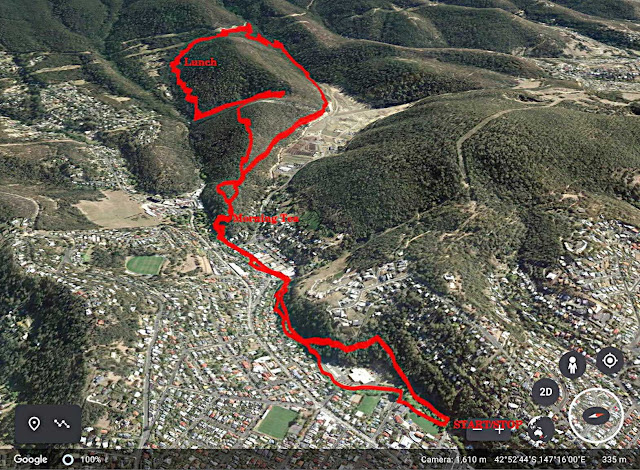 As everyone was finishing lunch and being astounded by a numbered tree nearby, I asked if anyone wanted to bet on which track Bob would take us on next. We were sitting between tracks for lunch, and the photo below shows three more choices. I thought the steep one on the right was a good bet, but couldn't rule out that Bob might ignore all of them and lead us into the bush.