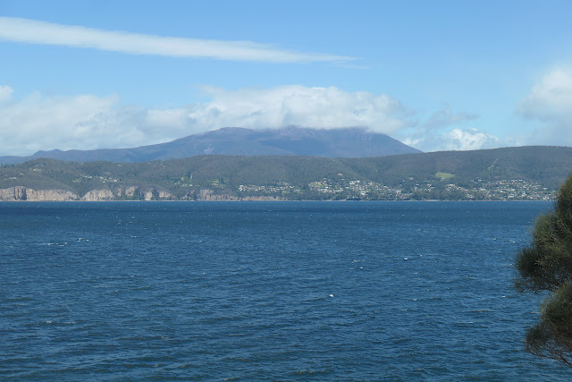 Looking across the Derwent River towards the Alum Cliffs between Taroona and Kingston with the Shot Tower vivible on the right hand side.